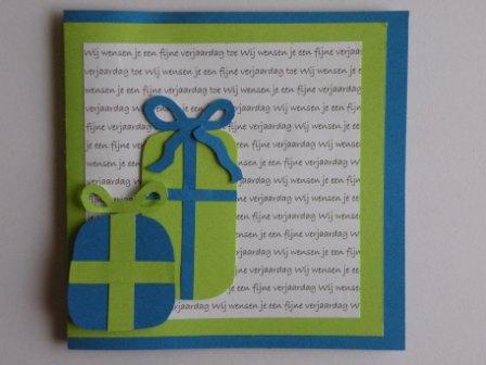 De witte achtergrond is gemaakt in Word: ik heb een hele pagina gemaakt met "Wij wensen je een fijne verjaardag toe" en deze afgeprint. Vervolgens heb ik hieruit een vierkant geknipt en dit op de kaart gekleefd.